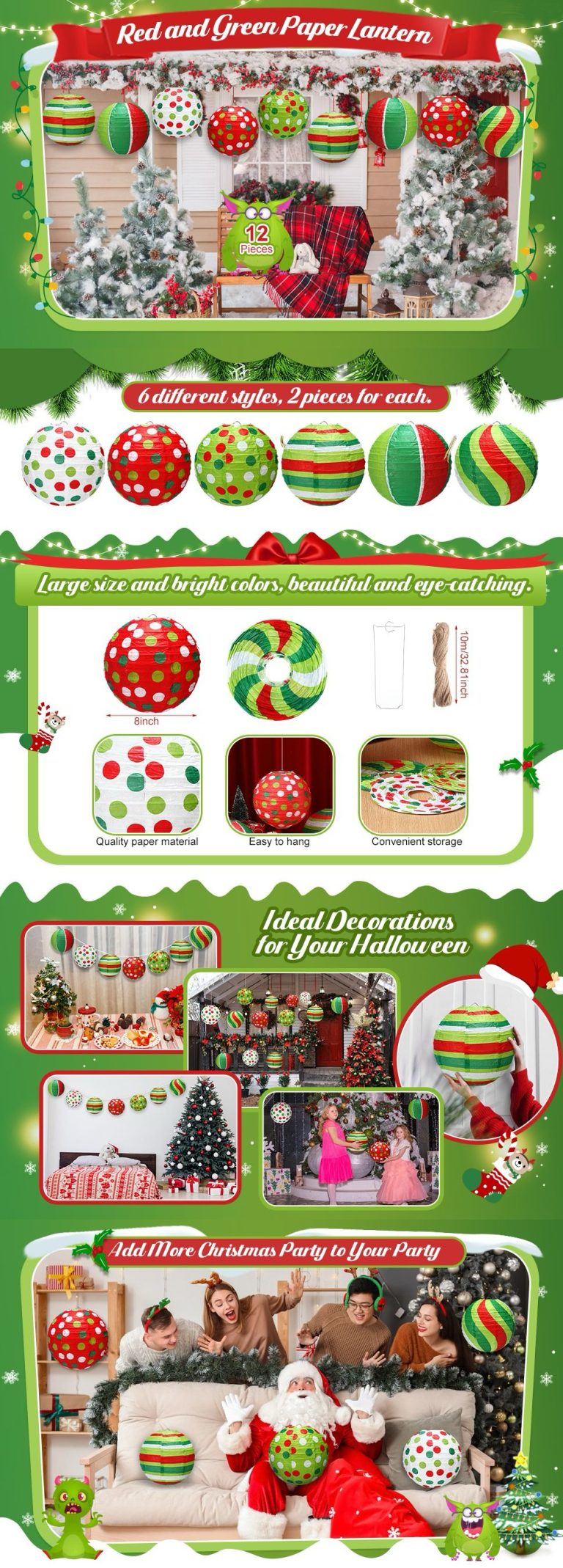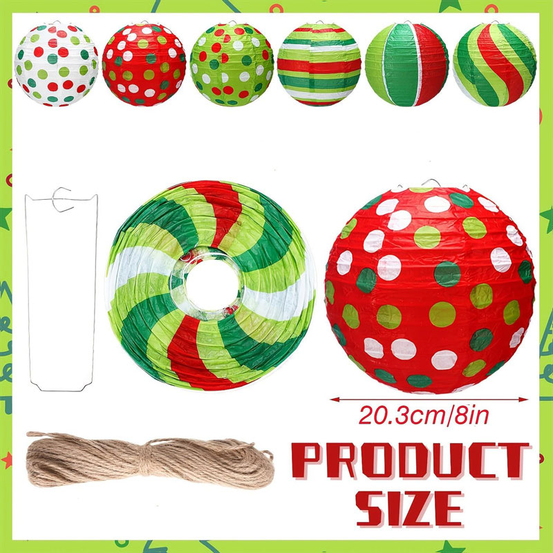 SIGNIFICANT DESIGN:Vibrant red-green themed DIY paper lanterns with playful patterns (polka dots and stripes options). You can hang them as indoor/outdoor decor, party accents, or holiday ornaments; they’re made of paper and metal materials (lightweight and reusable), bringing a lively, festive vibe to Christmas parties, baby showers, birthdays, or festivals, which is perfect for joyful and holiday-themed settings.