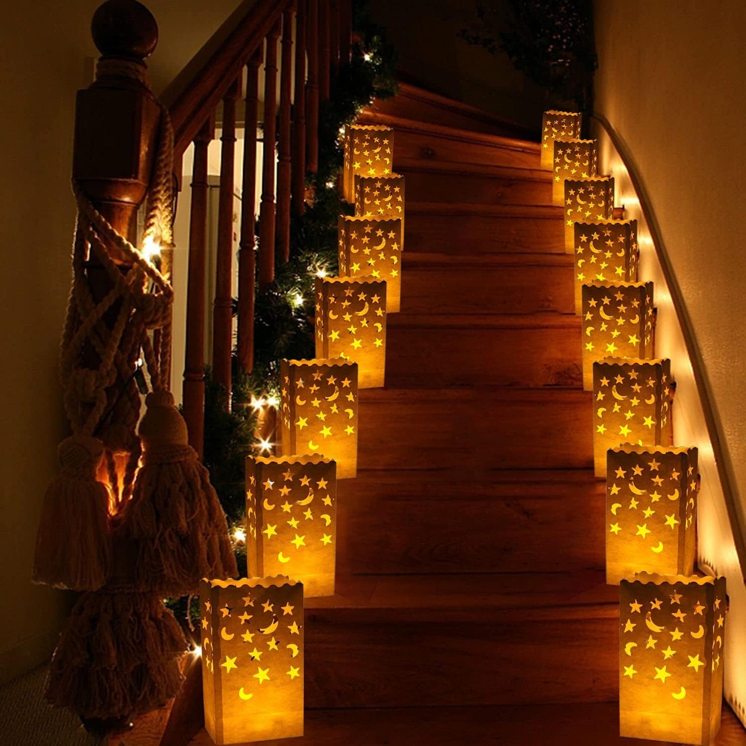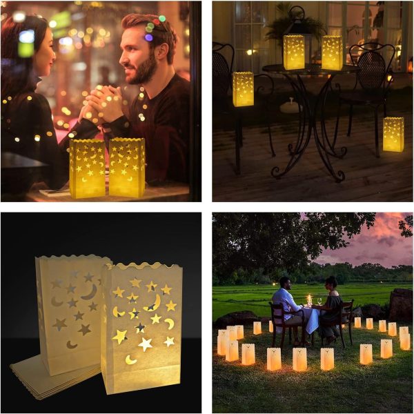 - SIGNIFICANT DESIGN:Star-and-moon patterned lantern candle bags (30 pieces total, no lights included) with a delicate fan-shaped design. You can place them as table decor, line them along paths, or arrange them for outdoor settings; made of durable, reusable flame-retardant material, they bring a dreamy, romantic vibe to weddings, Valentine’s Day, engagements, or proposal events, which is perfect for festive and romantic decors.