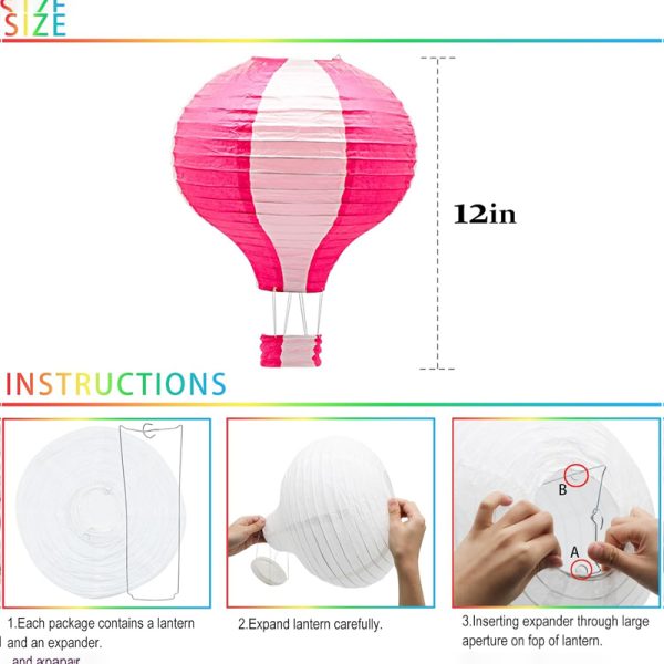 - PACKAGING INCLUDES:Come with 8 pieces of hot air balloon-shaped paper lanterns in total (all 12-inch/30.48cm size), covering 8 different colors. This 12-inch design is suitable for baby showers, birthdays, weddings and holiday decor. Installation components and guidance are also included for easy setup.